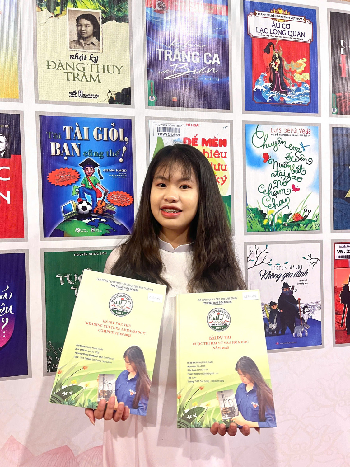 Hoàng Khánh Huyền có niềm say mê đặc biệt với sách. Đam mê đọc sách mang lại cho em nhiều giá trị quý báu như mở rộng kiến thức và vốn từ vựng, nâng cao khả năng tư duy, phân tích và kỹ năng giao tiếp. Vì vậy trước khi đến với giải Nhì Quốc gia Cuộc thi “Đại sứ văn hóa đọc năm 2025”, Khánh Huyền đã đạt giải Nhì cấp Huyện “Hội thi Kể chuyện tìm hiểu lịch sử truyền thống đấu tranh của Đảng bộ và Nhân dân huyện Đơn Dương”. Không chỉ say mê đọc sách, Hoàng Khánh Huyền còn là tấm gương tiêu biểu trong học tập, rèn luyện. Em đã đạt nhiều giải cao trong các Cuộc thi KHKT, Sáng tạo Thanh thiếu niên, nhi đồng và các hoạt động tình nguyện vì cuộc sống cộng đồng. Năm 2025, Khánh Huyền đã được Chủ tịch UBND xã Đơn Dương tặng Giấy khen “Đã có thành tích xuất sắc trong các phong trào thi đua yêu nước giai đoạn 2020 - 2025 trên địa bàn xã Đơn Dương”. Đến với Cuộc thi “Đại sứ văn hóa đọc năm 2025”, trong hàng trăm đầu sách đã có và được đọc qua, Khánh Huyền lựa chọn tập Hồi ký “Gia đình, bạn bè và đất nước” của bà Nguyễn Thị Bình, nguyên Phó Chủ tịch nước, nữ Bộ trưởng Ngoại giao đầu tiên, Trưởng đoàn đàm phán của Chính phủ Cách mạng Lâm thời Cộng hòa miền Nam Việt Nam tại Hòa đàm Paris.