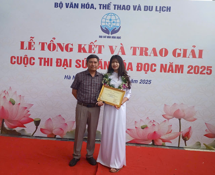 Ông Thái Anh Long – Bí thư Chi bộ, Hiệu trưởng nhà trường và em Hoàng Khánh Huyền tham dự Lễ tổng kết và trao giải Cuộc thi “Đại sứ văn hóa đọc năm 2025”