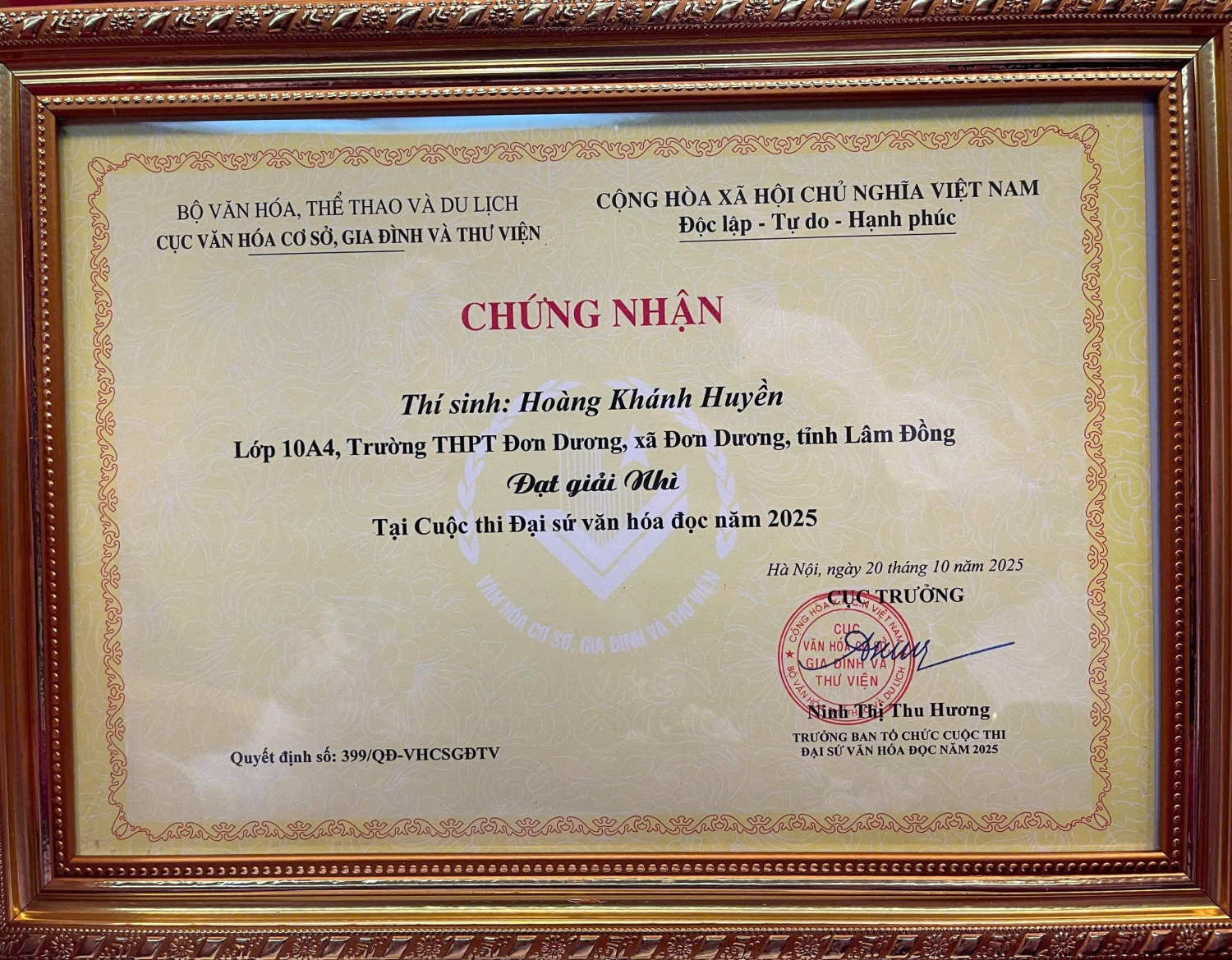 Giấy chứng nhận giải Nhì Cuộc thi “Đại sứ Văn hóa đọc năm 2025” của Hoàng Khánh Huyền